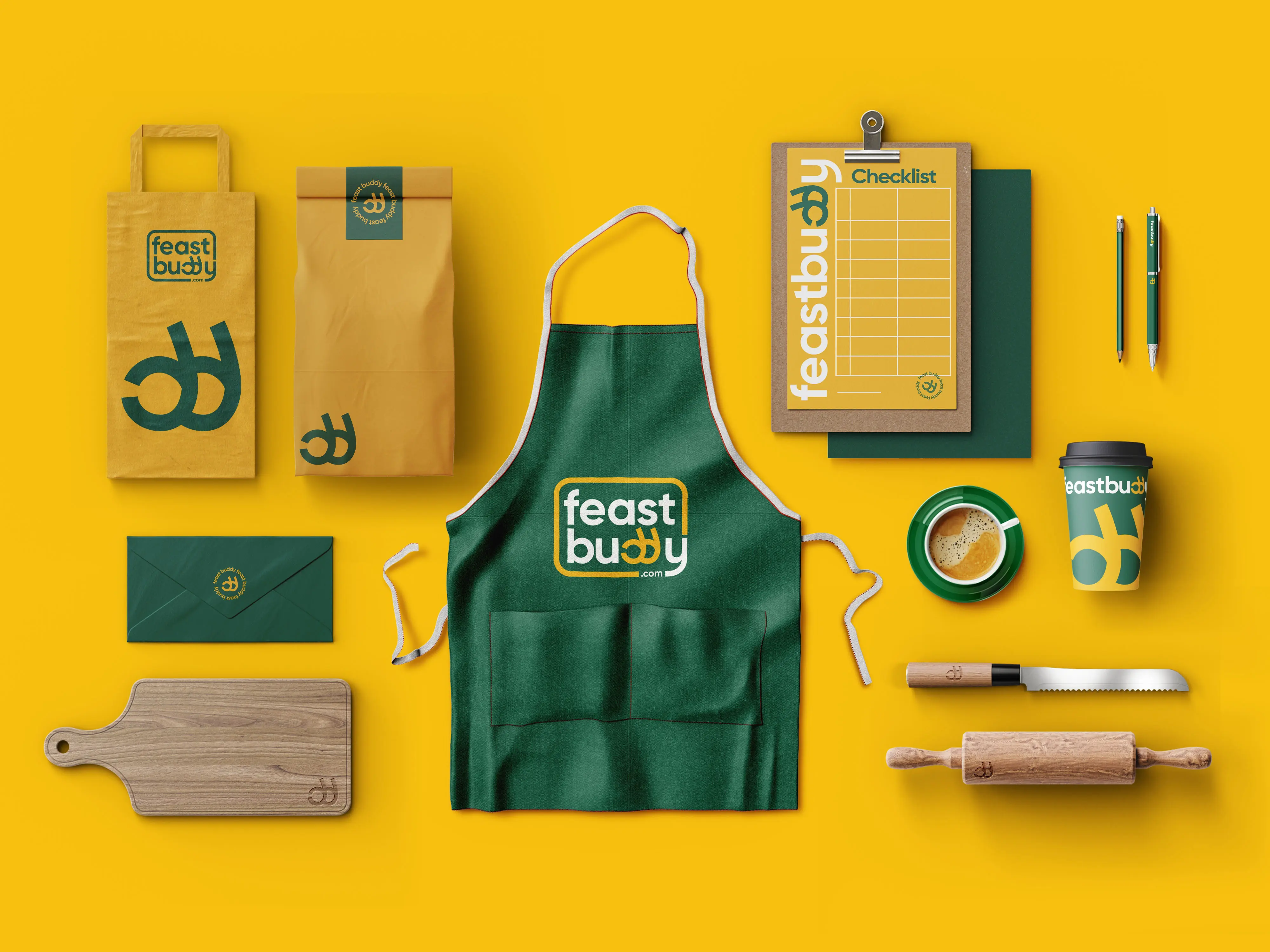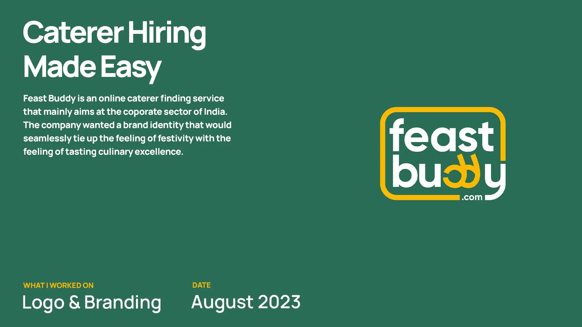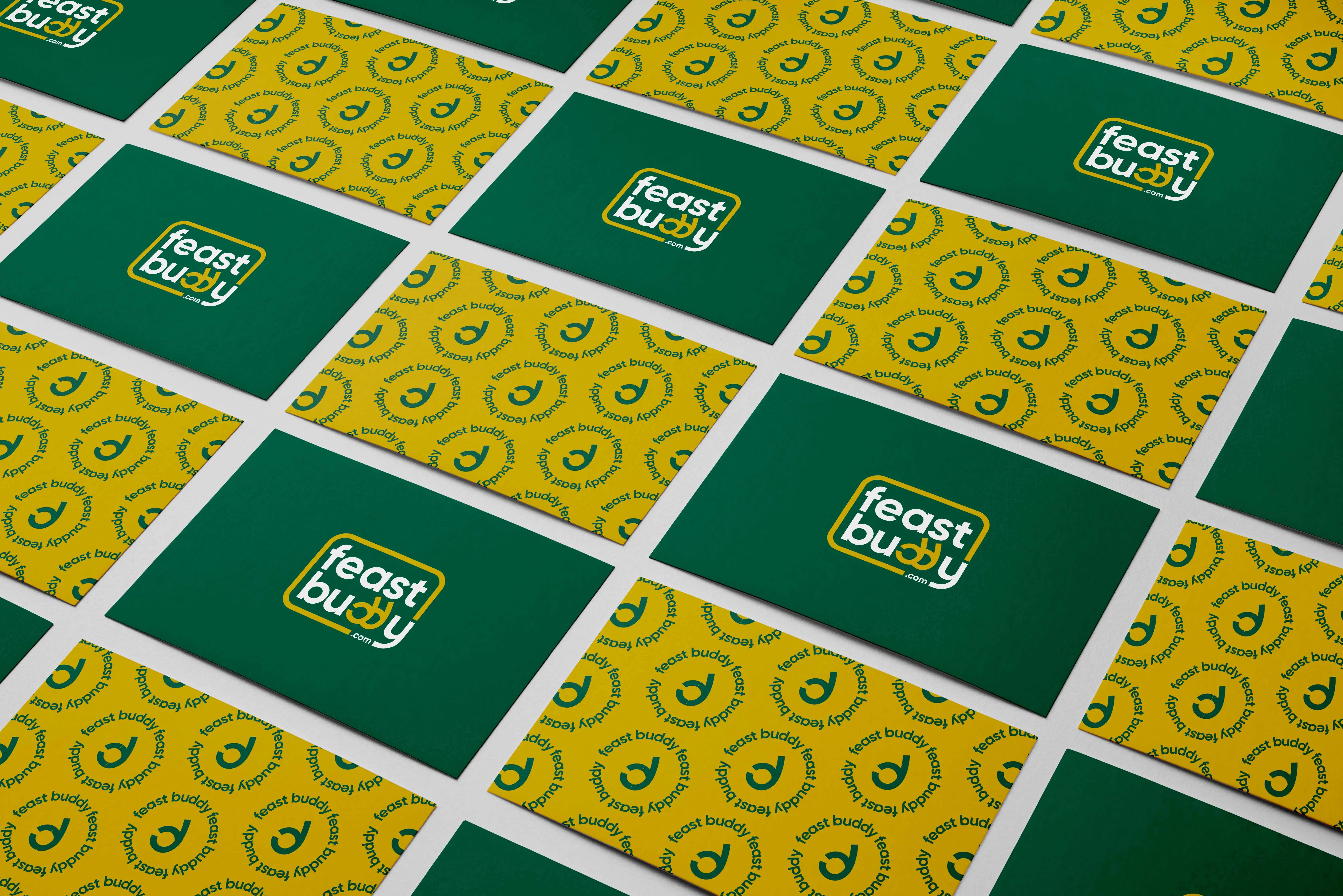 I designed the full brand identity, building the visual language around the warmth and festivity of Indian celebration culture. The color palette — a deep verdant green paired with a rich golden yellow — nods to the vibrancy of the occasions the platform is made for. The logotype has a quiet bit of wit embedded in it: two minimal chef's kiss gestures tucked into the double-d of "Buddy," a small detail that rewards a second look. The identity extends across packaging and brand touchpoints, keeping that same balance of approachable and celebratory throughout.